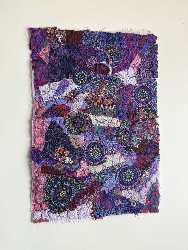 This piece is made with shades of purple quilt weight cotton fabrics. Piece measures 9.5" by 14". Cut and placed on a base of fleece. Topped with purple tulle and free motion embroidered in a circular doodle pattern. Use for mixed media. You can make a small fabric bowl, use as a panel for a bag or a garment. Journal cover...Pouch... Fiber Art Greeting Cards...Fiber Jewelry. I am making so many lately I can't keep them all. My gift is to share with you :)